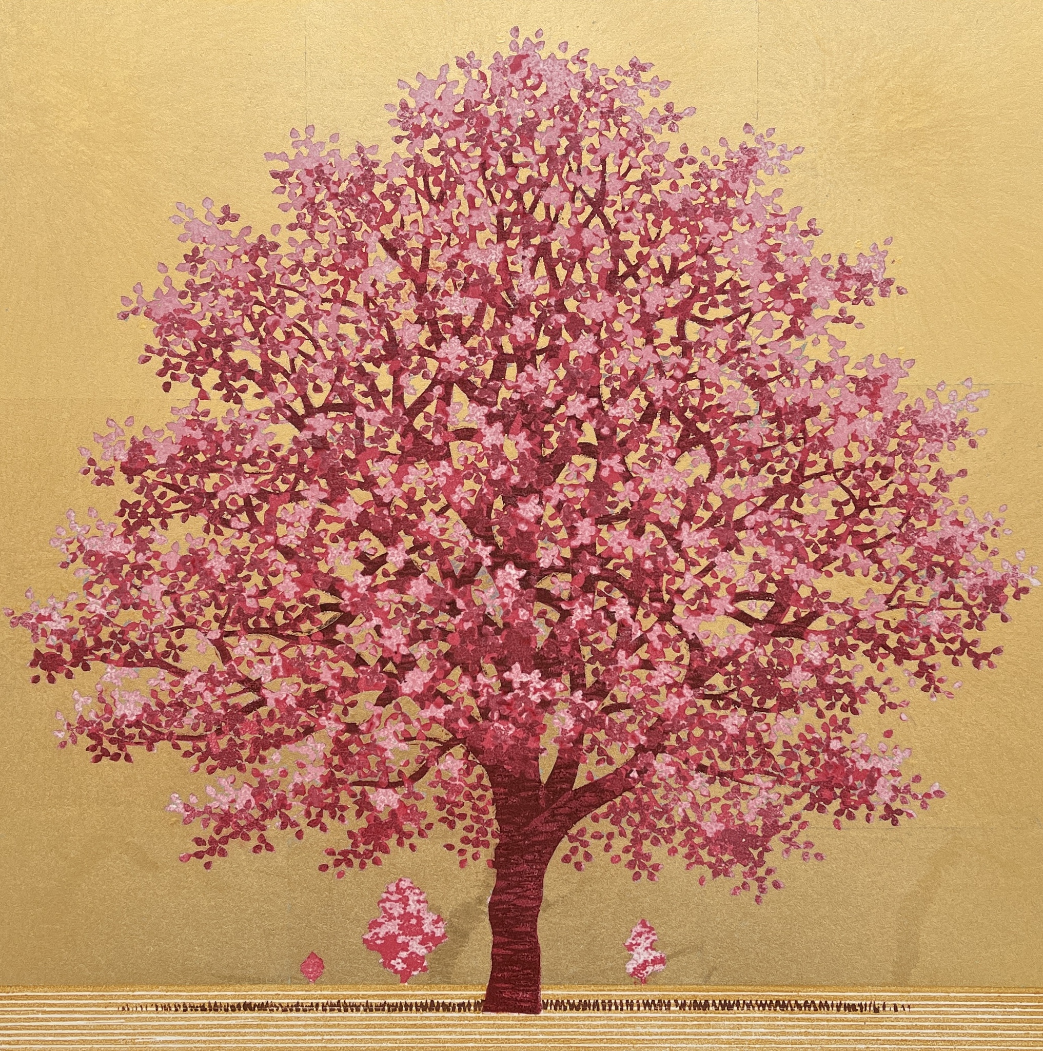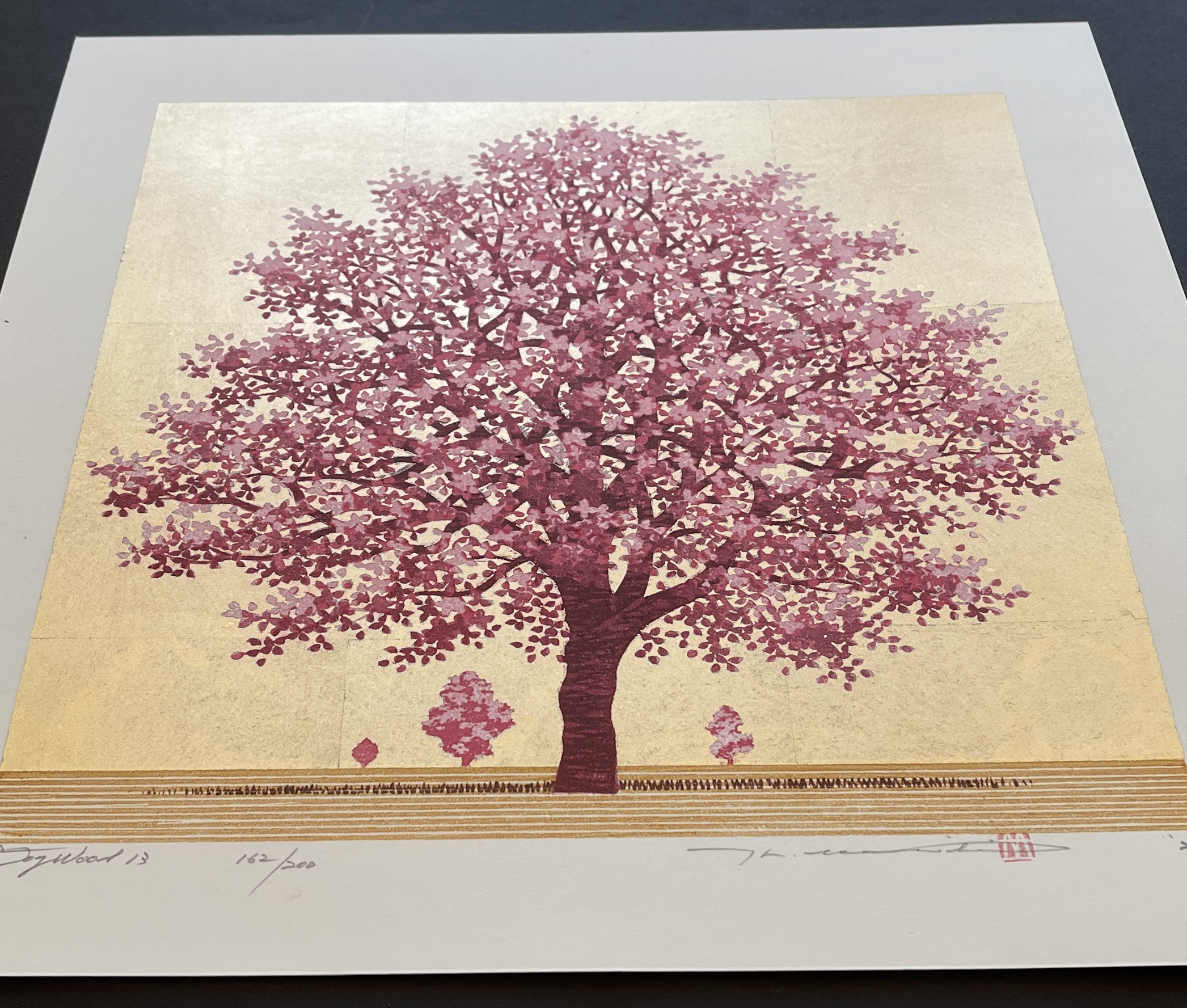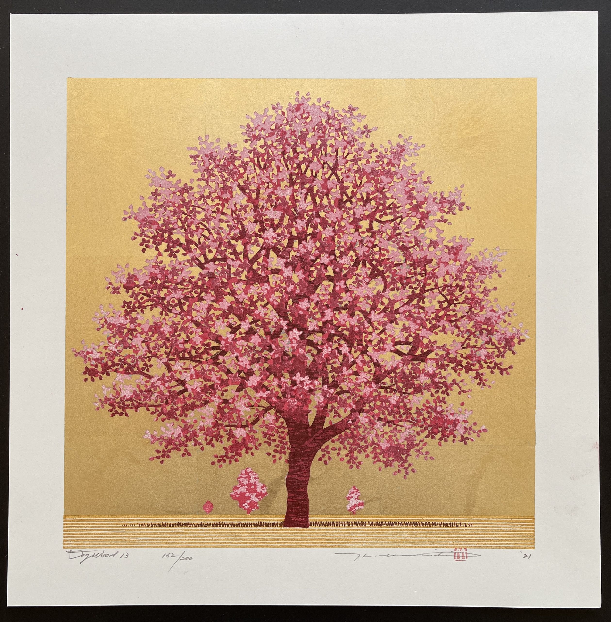Hajime Namiki (b. 1947) is a modern Japanese woodblock artist. Originally trained as a sculptor, he transitioned to woodblock printing in the late 1970s. He limits himself to a small number of themes, and within those he experiments and varies a tremendous amount. Among these themes, are trees scenes (varying from dogwood to pine trees), dragons and cherry blossoms.