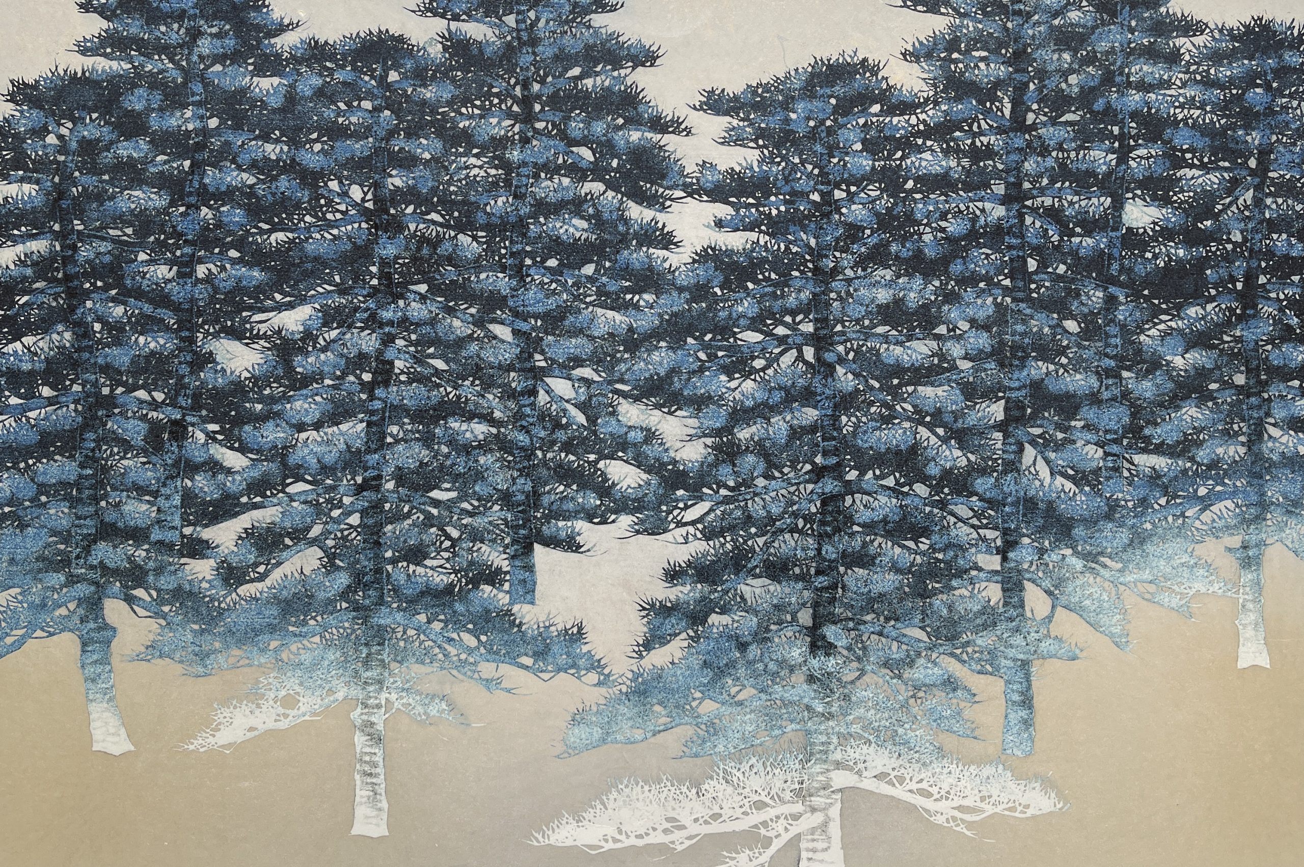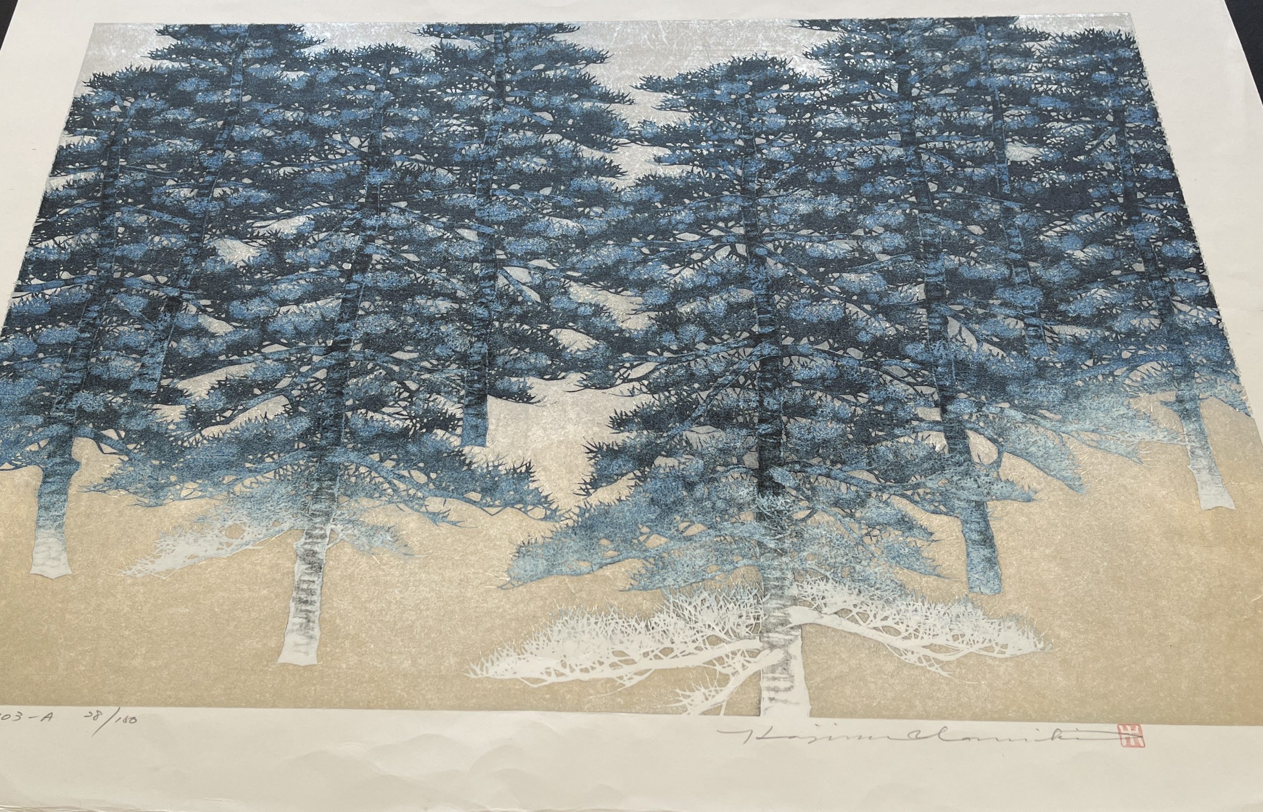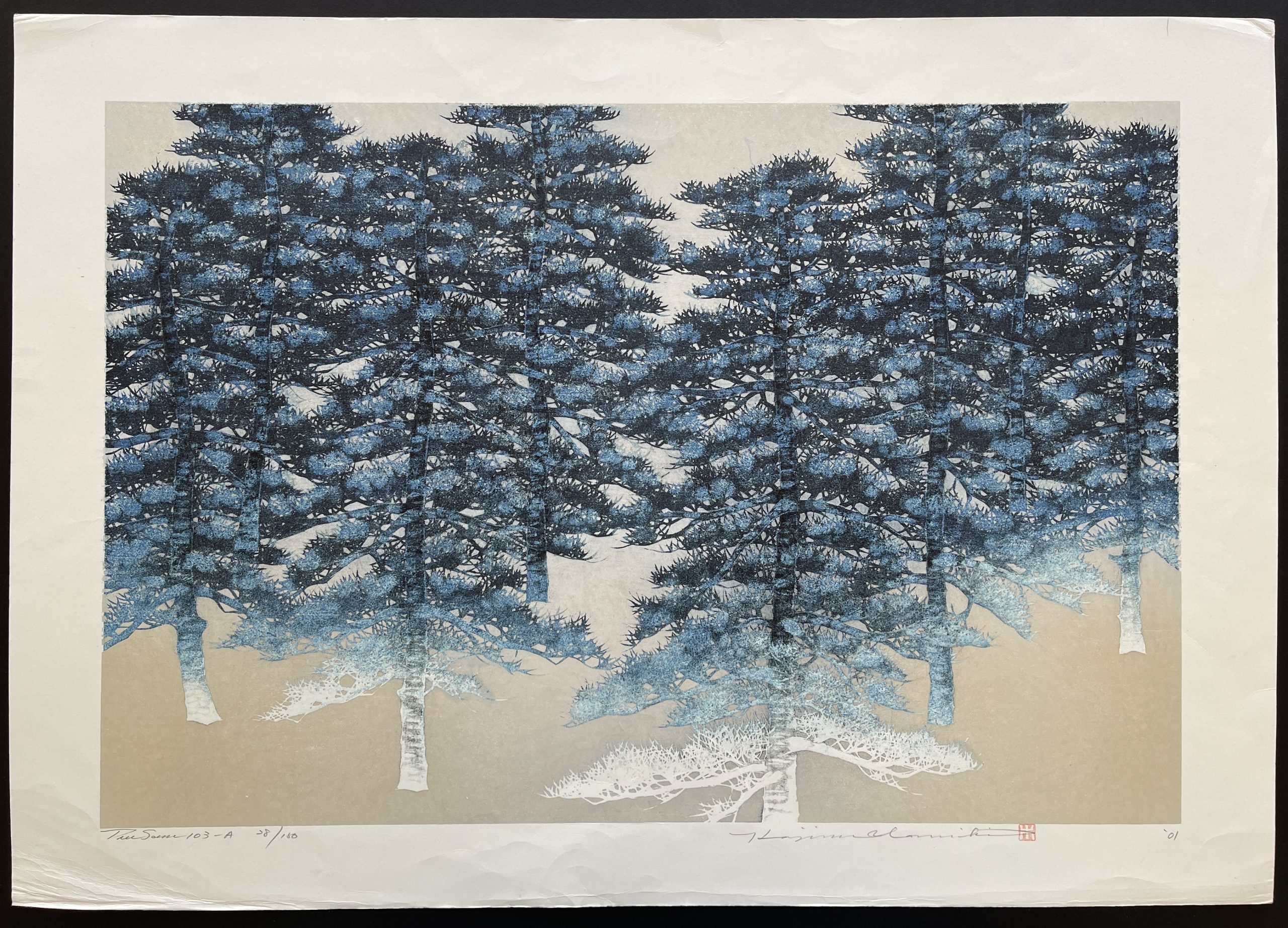 Hajime Namiki (b. 1947) is a modern Japanese woodblock artist. Originally trained as a sculptor, he transitioned to woodblock printing in the late 1970s. He limits himself to a small number of themes, and within those he experiments and varies a tremendous amount. Among these themes, are trees scenes (varying from dogwood to pine trees), dragons and cherry blossoms.