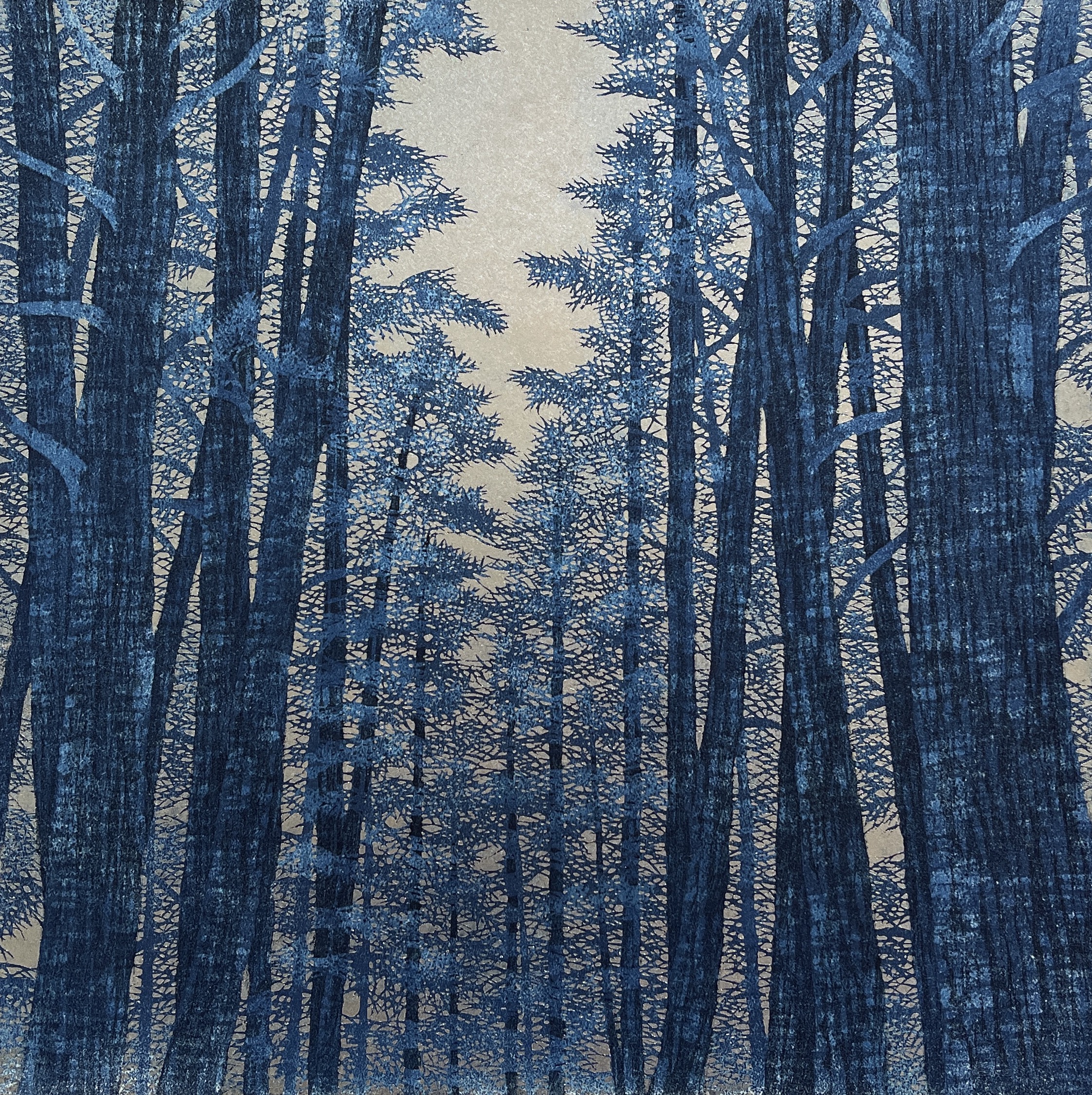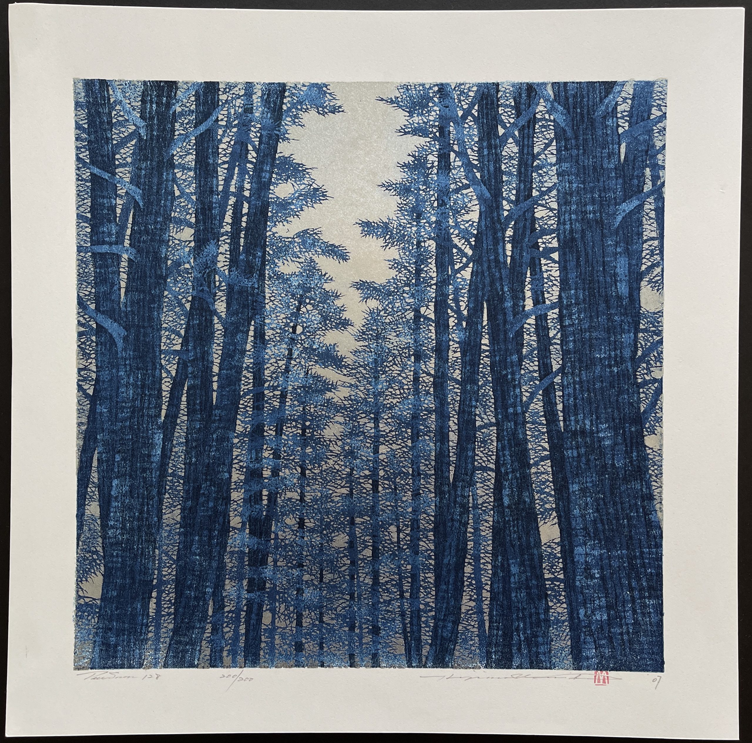 Hajime Namiki (b. 1947) is a modern Japanese woodblock artist. Originally trained as a sculptor, he transitioned to woodblock printing in the late 1970s. He limits himself to a small number of themes, and within those he experiments and varies a tremendous amount. Among these themes, are trees scenes (varying from dogwood to pine trees), dragons and cherry blossoms.