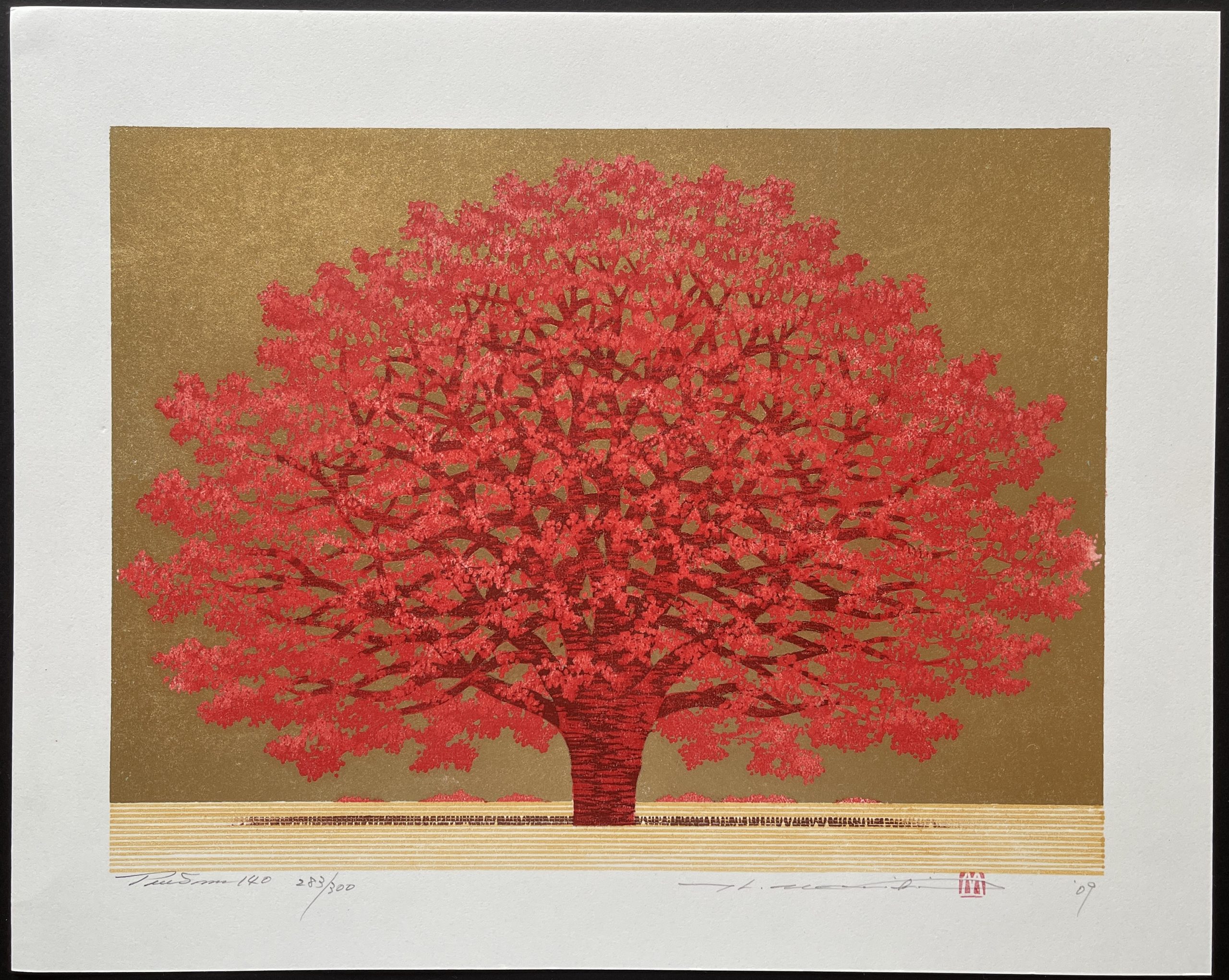 Hajime Namiki (b. 1947) is a modern Japanese woodblock artist. Originally trained as a sculptor, he transitioned to woodblock printing in the late 1970s. He limits himself to a small number of themes, and within those he experiments and varies a tremendous amount. Among these themes, are trees scenes (varying from dogwood to pine trees), dragons and cherry blossoms.