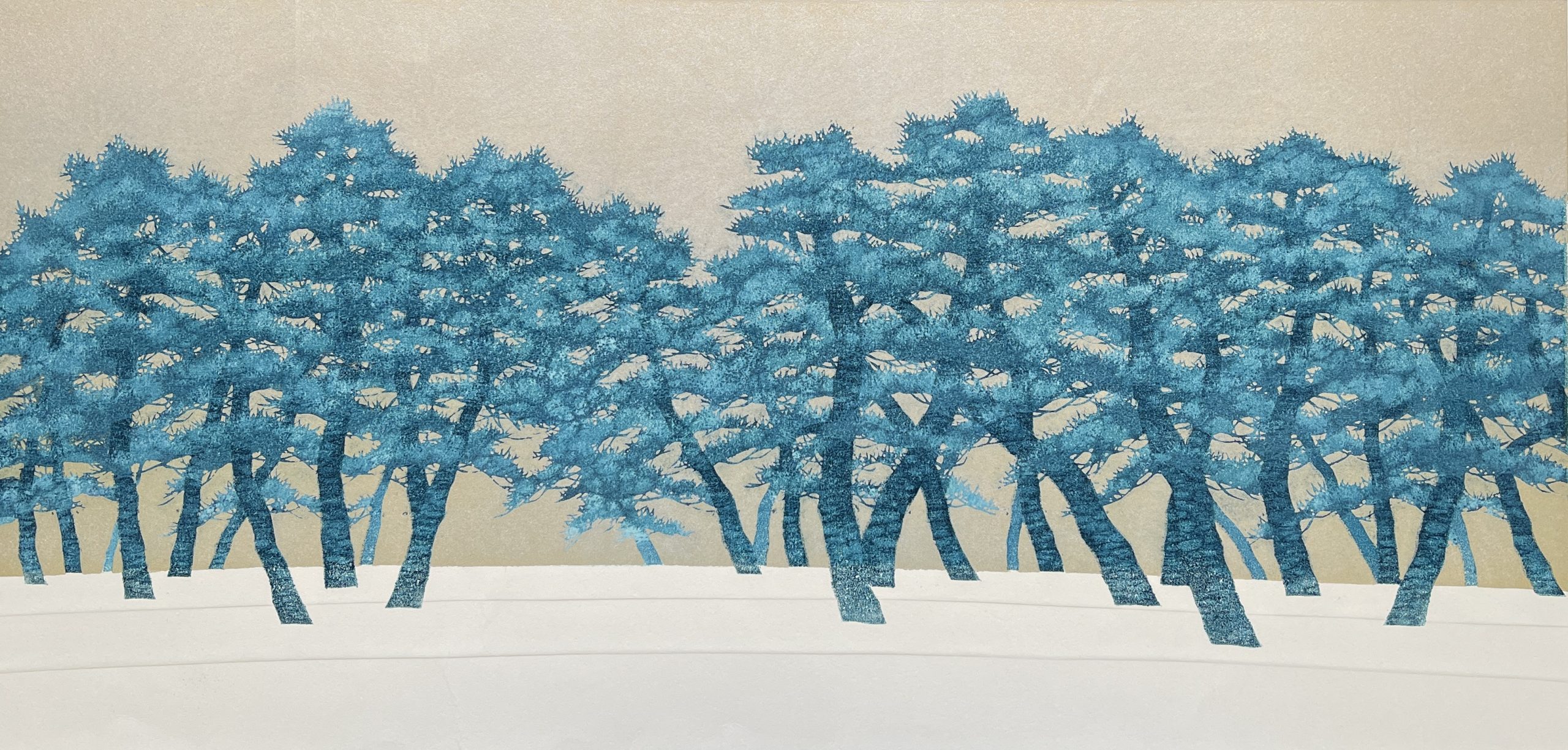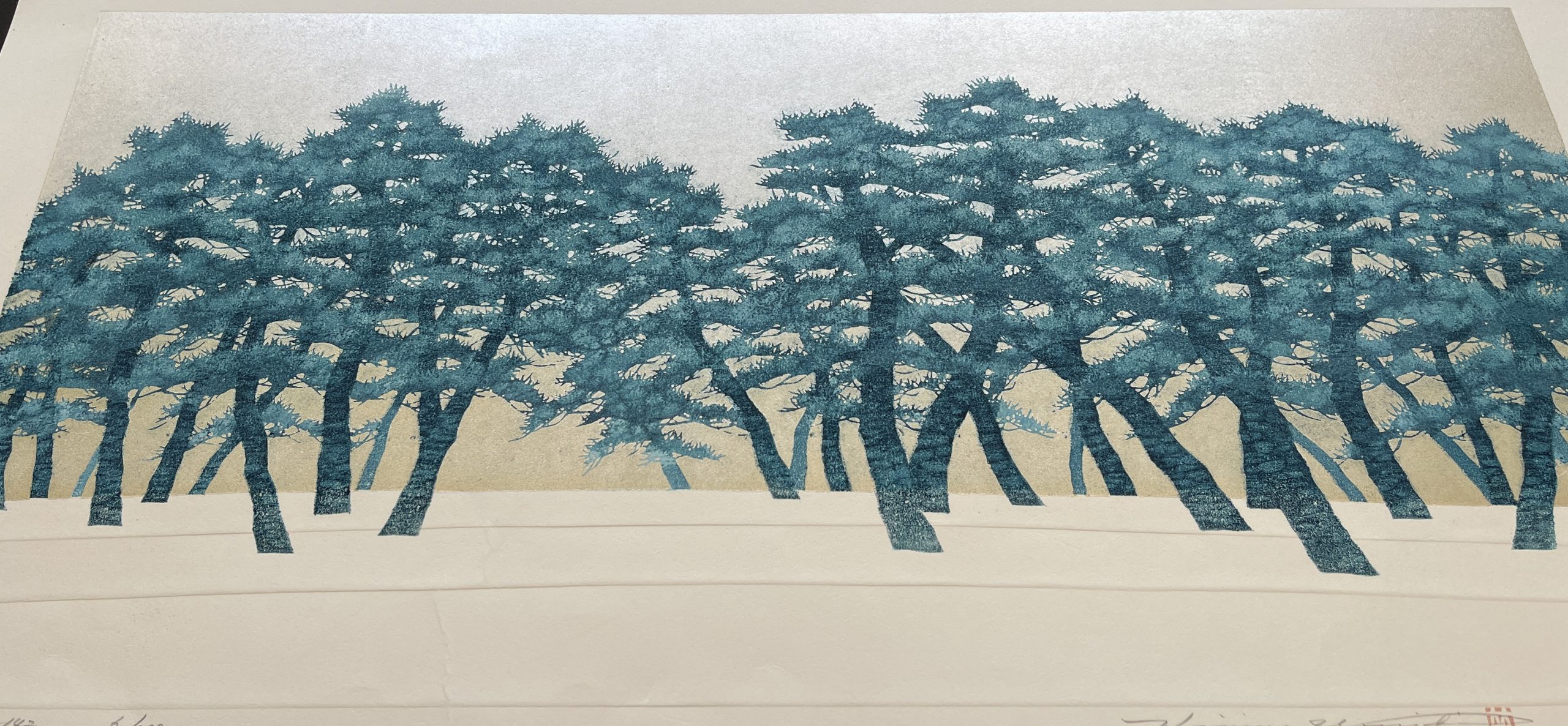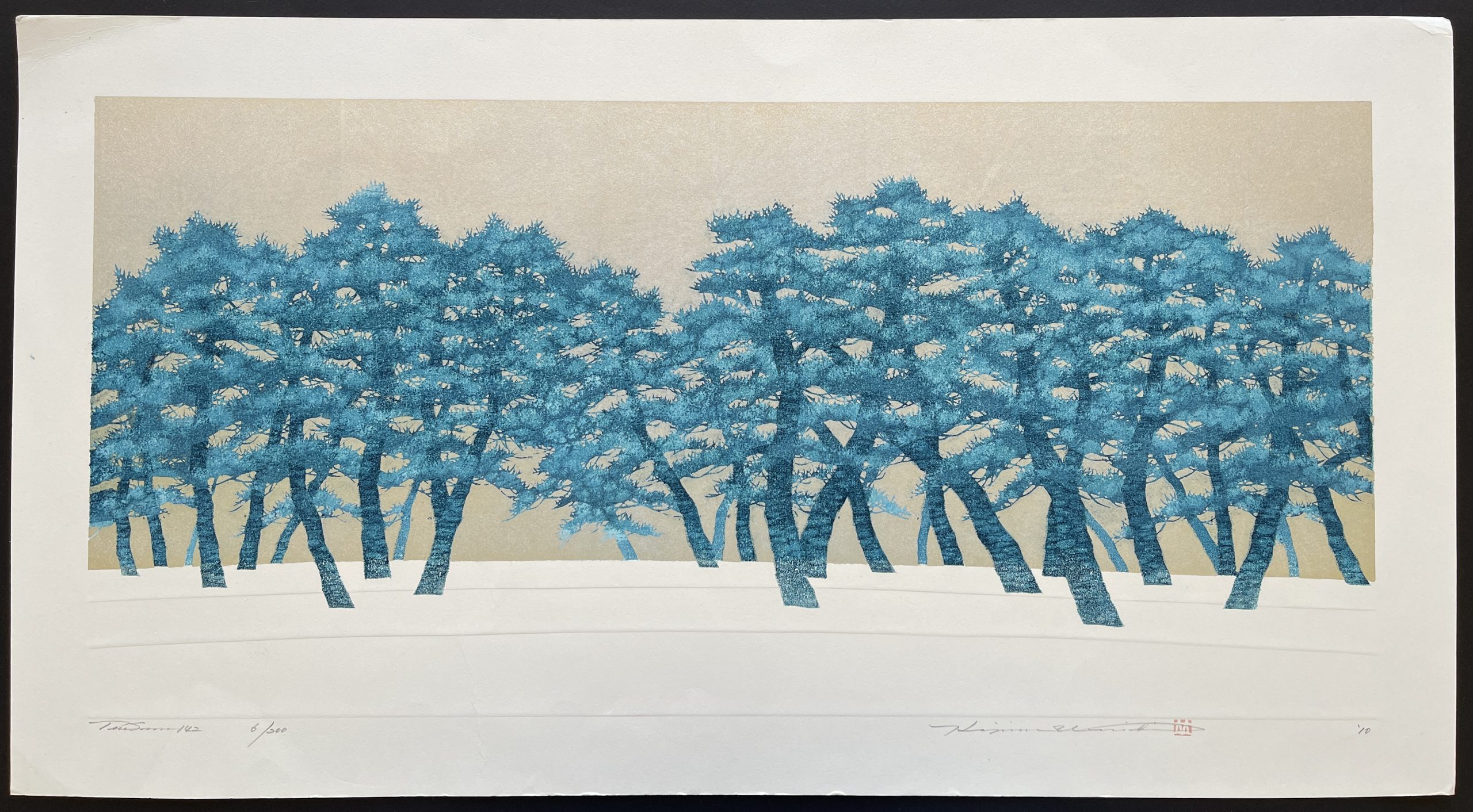Hajime Namiki (b. 1947) is a modern Japanese woodblock artist. Originally trained as a sculptor, he transitioned to woodblock printing in the late 1970s. He limits himself to a small number of themes, and within those he experiments and varies a tremendous amount. Among these themes, are trees scenes (varying from dogwood to pine trees), dragons and cherry blossoms.