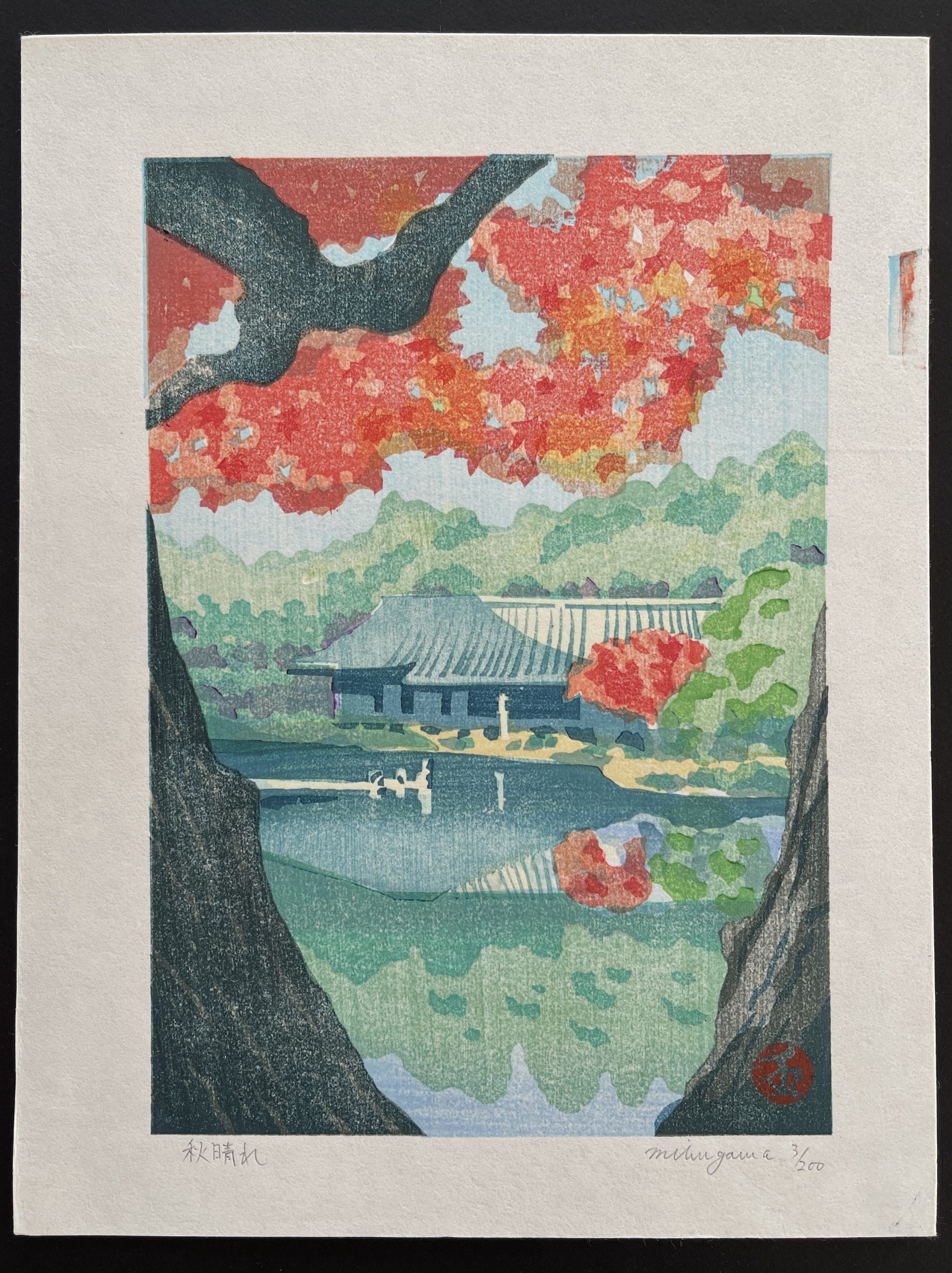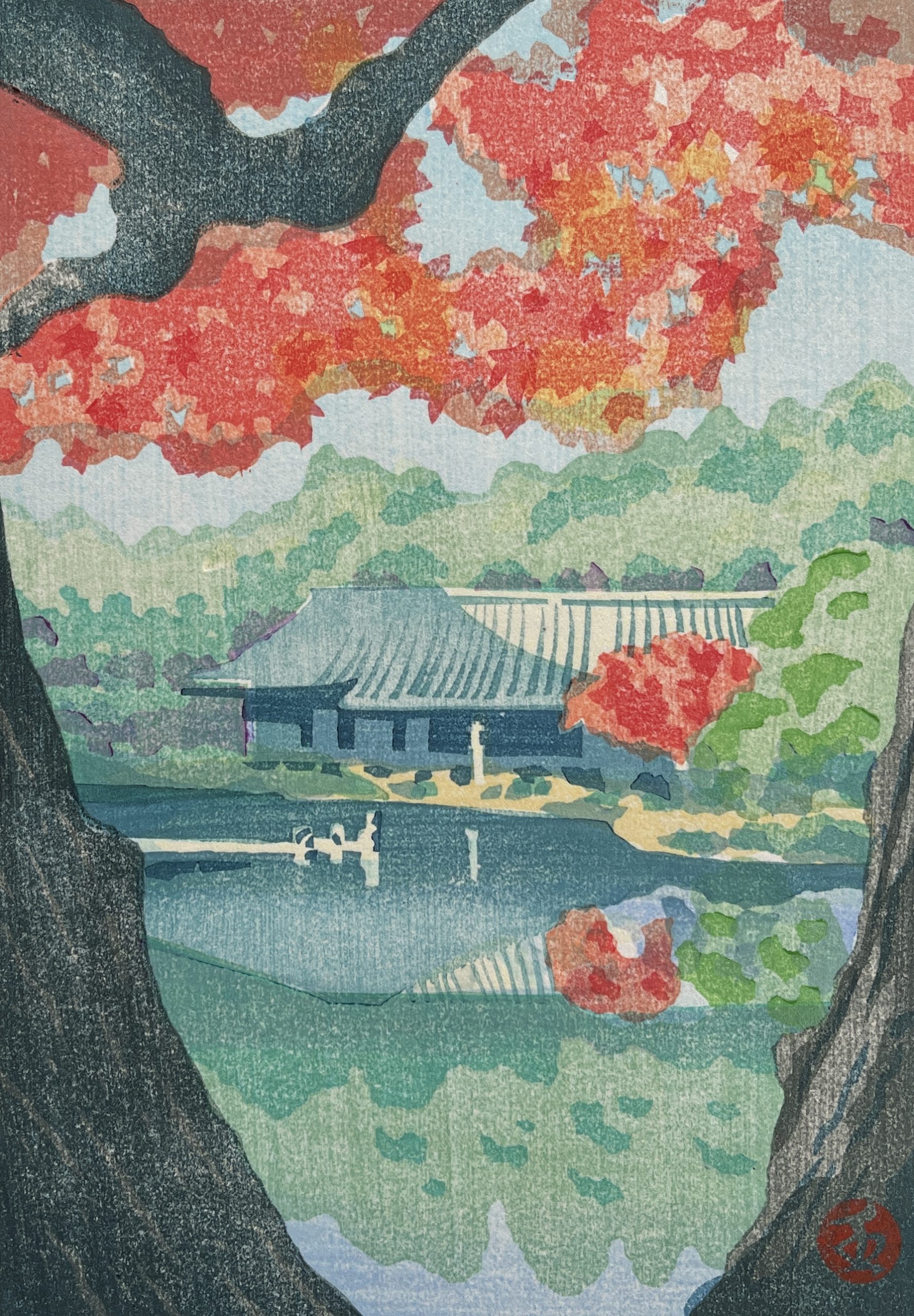 This style is very successful in displaying the countryside, woods and temples in nature. Though there is no Japanese woodblock print artist that is truly close in style, the prints of Maeda Koichi do share the countryside theme often, and with that also the use of many shades of green.