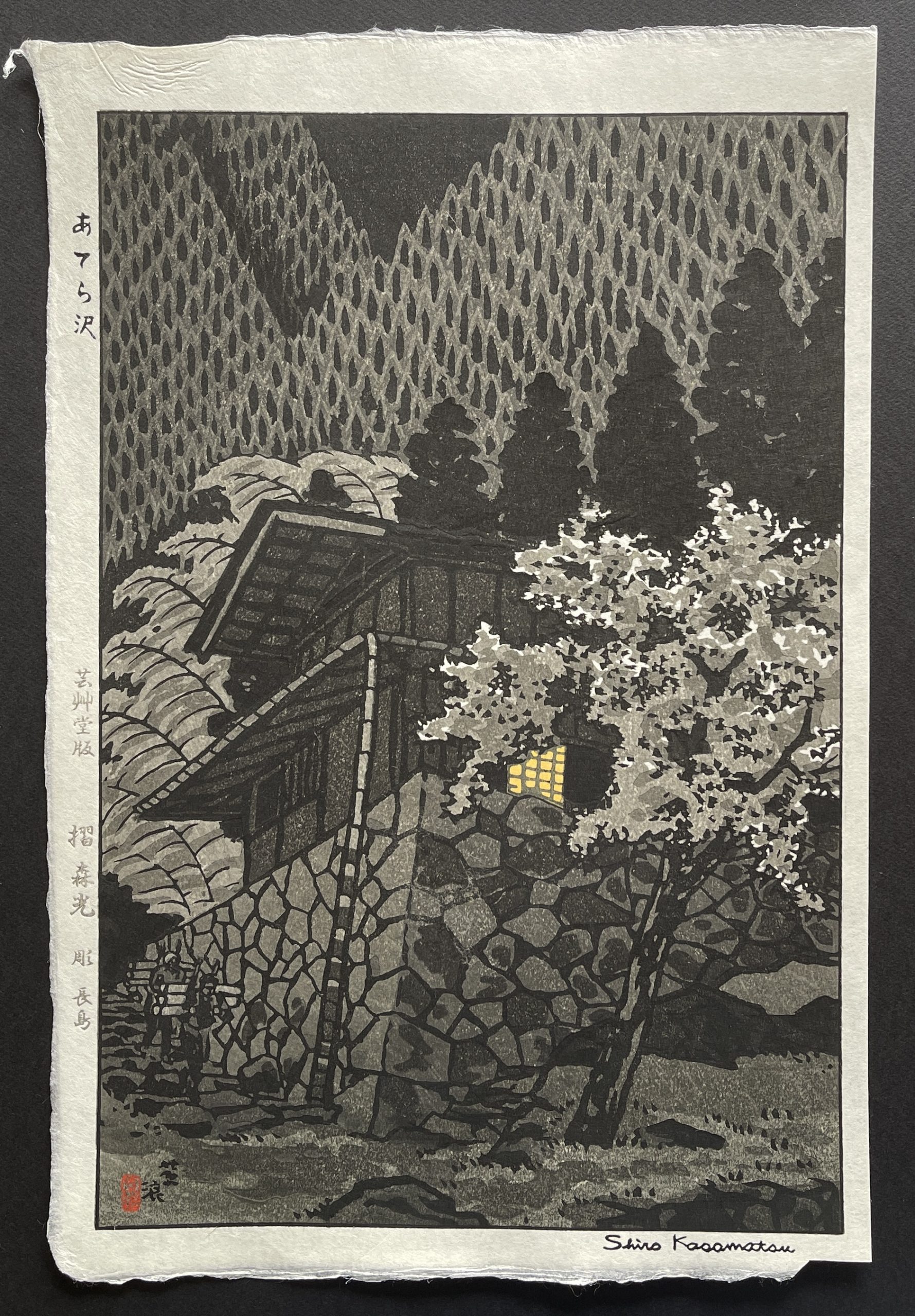 Kasamatsu Shiro (1898-1991) was a prolific and famous woodblock artist. When only aged thirteen he started as an apprentice. He could trace part of his artistic lineage back via Kaburagi and Yoshitoshi, connecting him to the great Ukiyo-e masters of the 19th century.