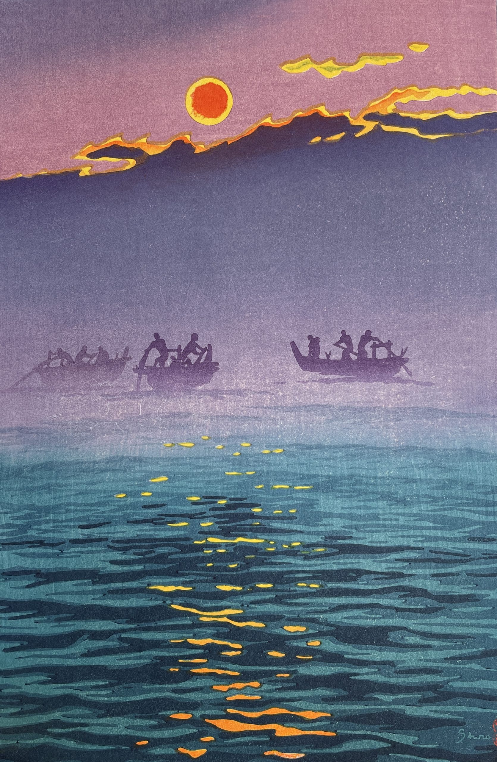 This print is easily identifiable as a work of Kasamatsu Shiro. Characteristic features include the use of his favorite color, purple, in the sky, and the masterful depiction of water and waves, a recurring element in many of his prints. With a limited number of strokes, Kasamatsu Shiro captures the essence of the morning waves so vividly that one can almost imagine diving into them. Noteworthy is the excellent printing, truly showing the boatmen to gradually disappear in the morning fog.