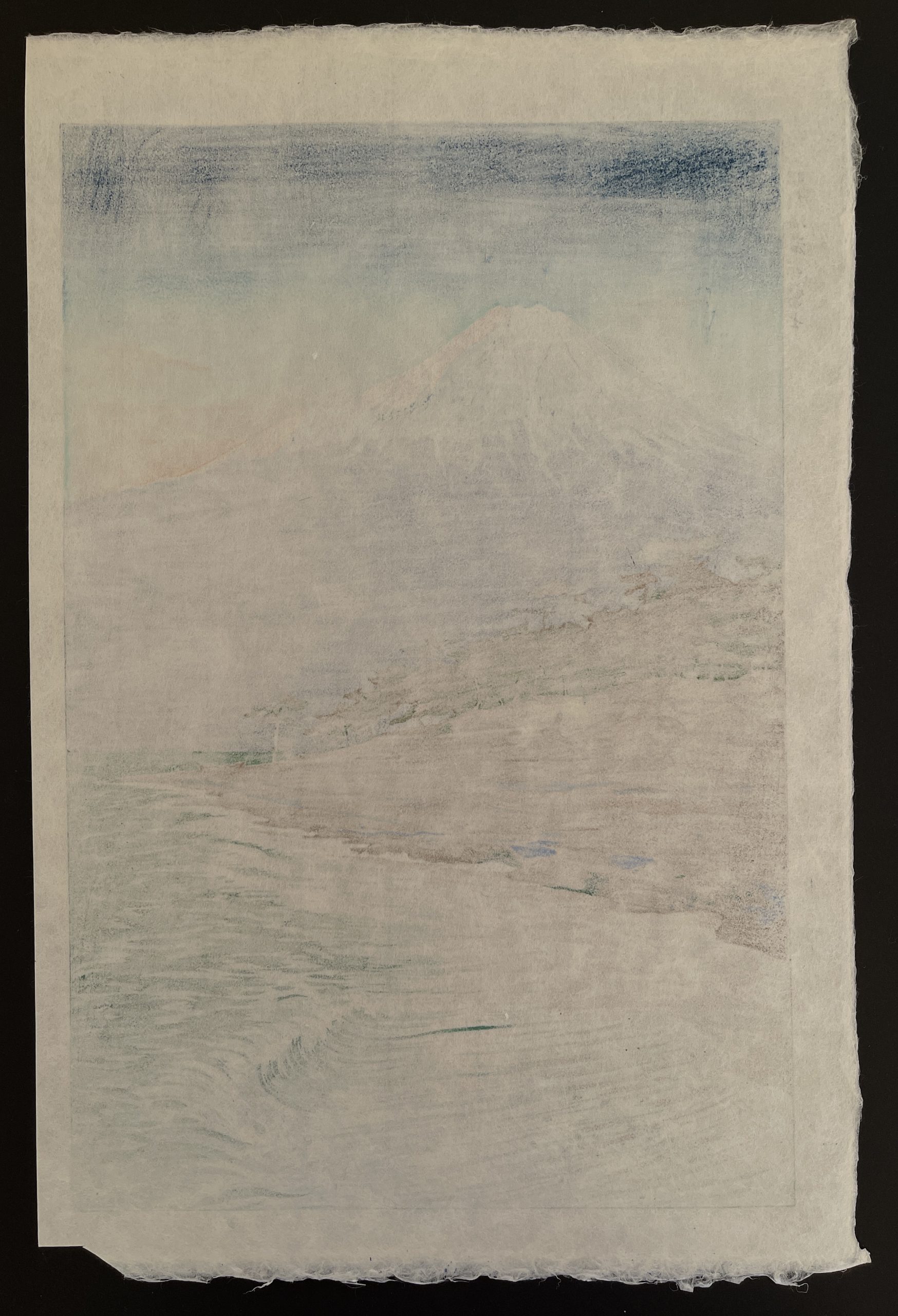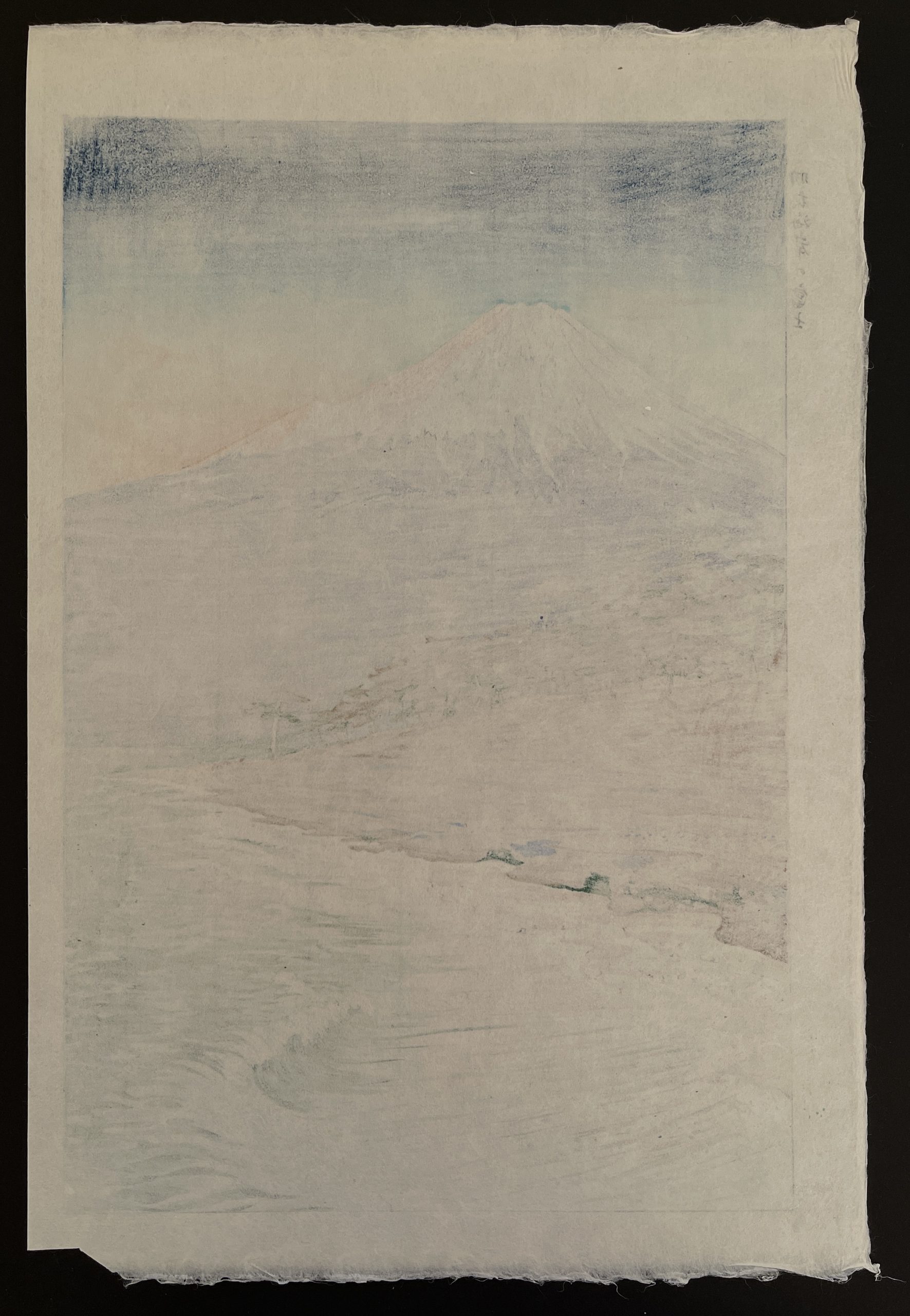 As in all six completed prints of Koichi Okada’s series “Twelve Views of Japan”, Mount Fuji is depicted in full in the background. In the current print, the sea is seen in the foreground, crashing its waves on the coast, leading to a more dynamic print than the other mostly tranquil prints of the series.
