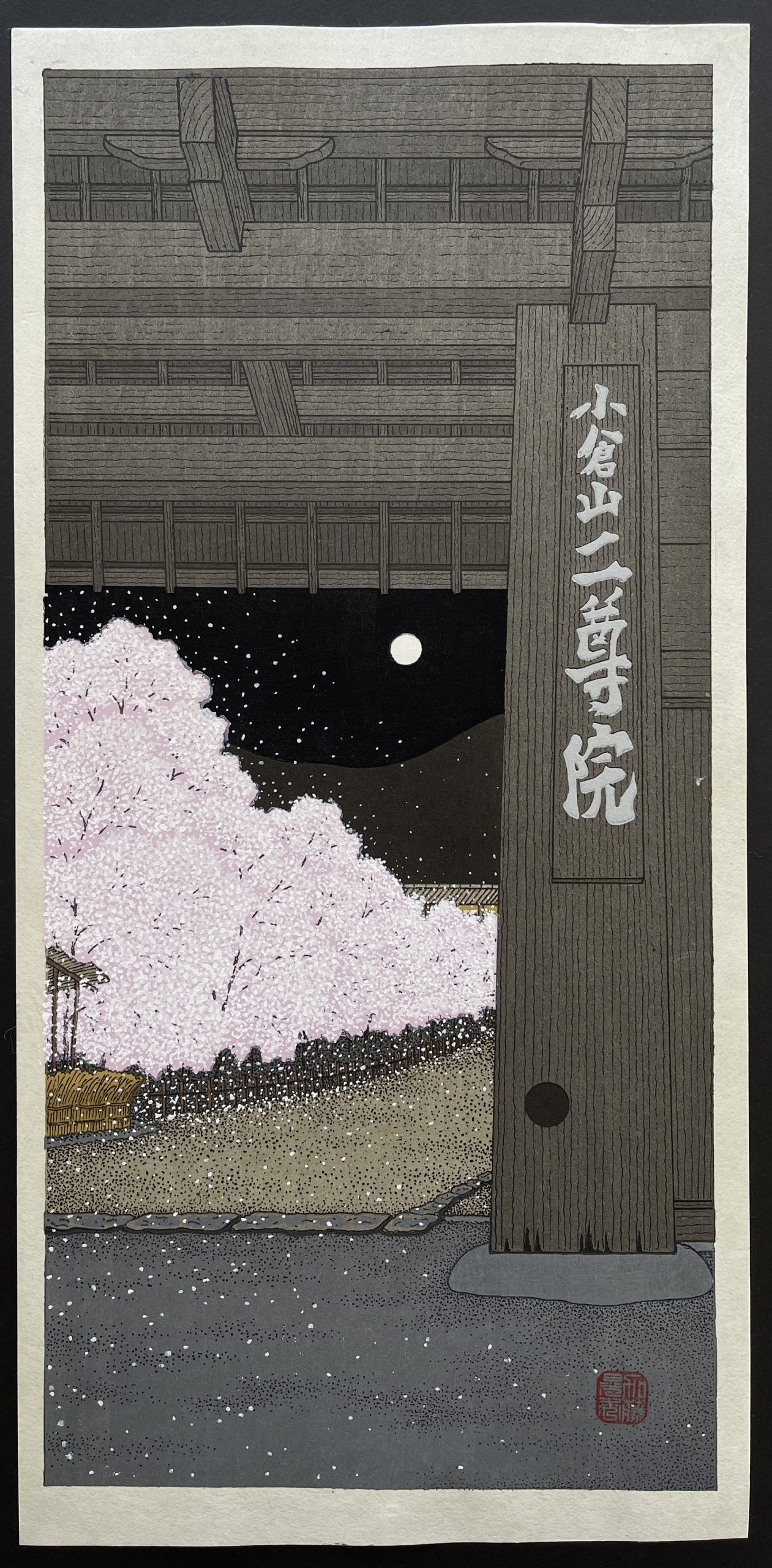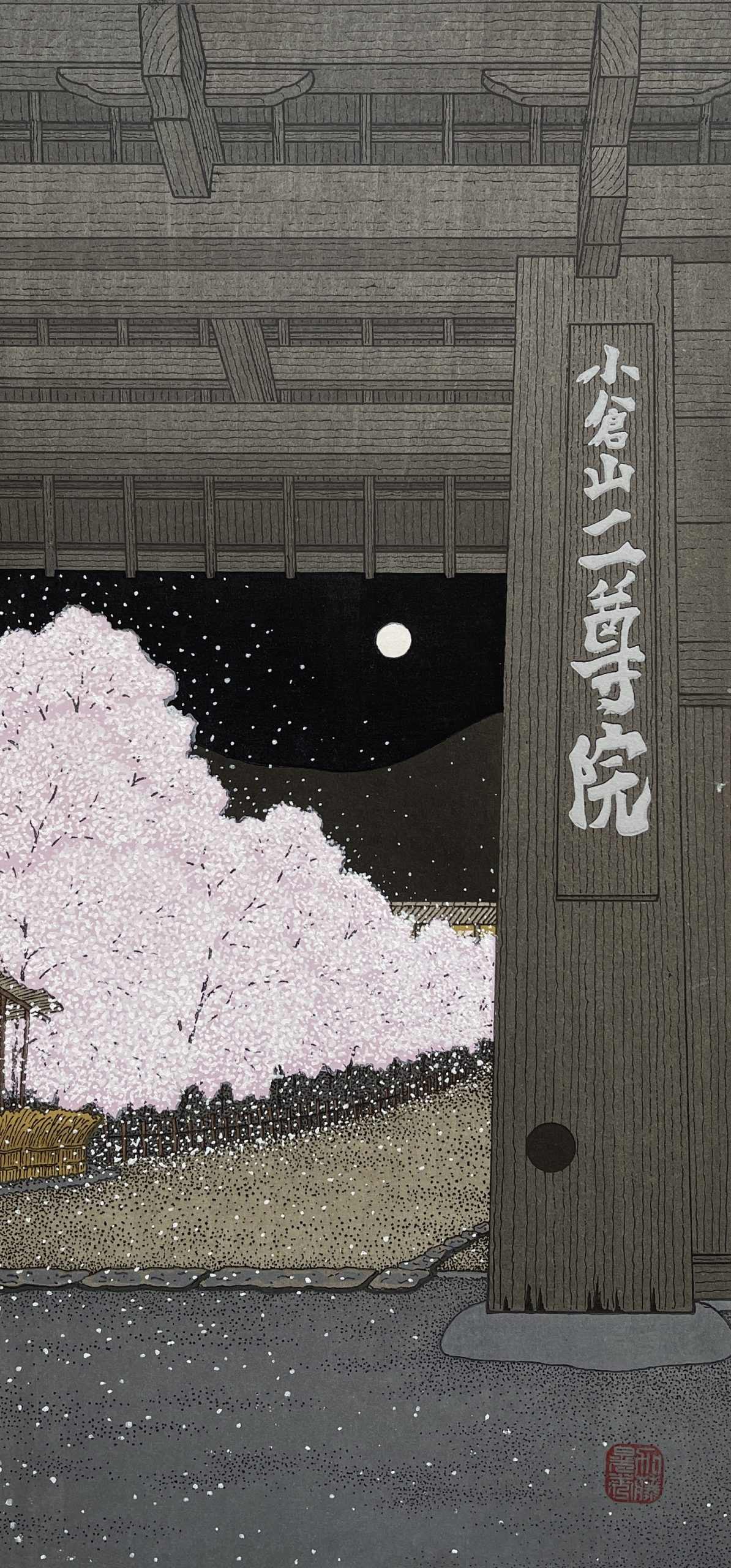 Depicted here is the main gate of the Nison-in Temple, a Buddhist temple in Kyoto. Teruhide Kato often utilizes unusual perspectives in his art. Whereas most artists would show the temple, or its gate, from the outside, Teruhide Kato’s composition reverses this, and lets the viewer look from almost within the gate to the surrounding trees and night, successfully drawing the observer into the image.